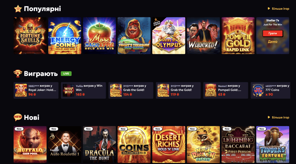 Усього на платформі зібрано понад 2 000 ігор — сучасні слоти (зелена зона, фрукти, Megaways, Hold & Win), live-ігри, класичні настолки та краш-ігри. Провайдери: NetEnt, Evolution, 3 OAKS, Play’n GO, Pragmatic Play, BGaming, Endorphina, Thunderkick, Play’n GO, NetGame Entertainment (український). Live-сегмент активно розширюється — додані українські кімнати з україно- та англомовними дилерами.