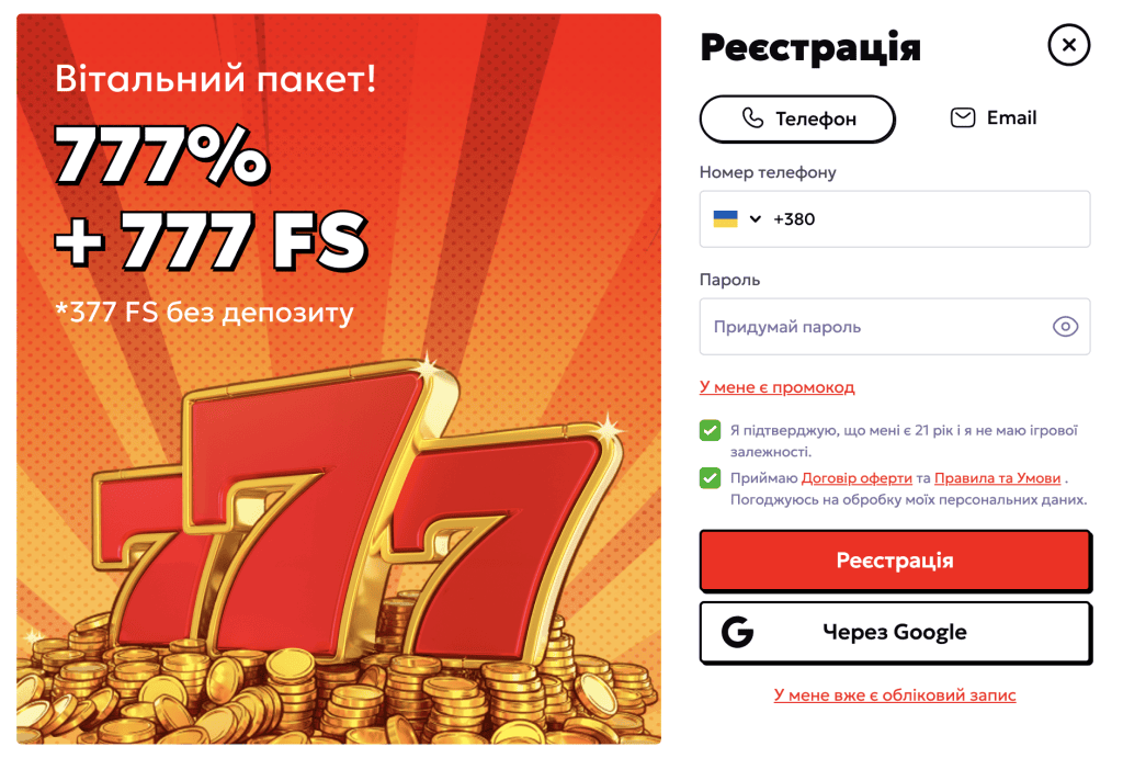 Реєстрація доступна через email, телефон або Google-аккаунт. Потрібно підтвердити 21-річний вік і прийняти умови.